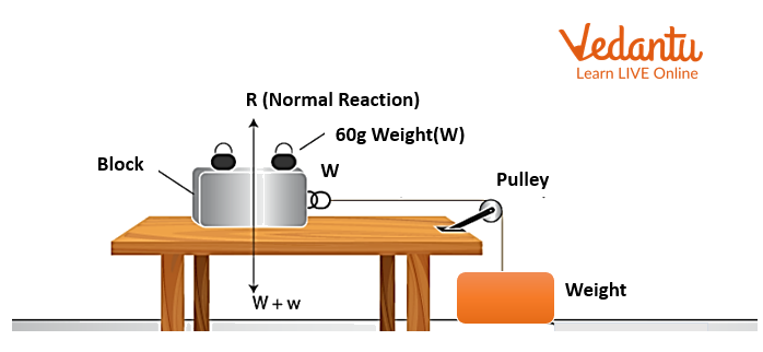 - Placing the block on the table and adding known weights on top of it. The total weight (block + added weights) equals the Normal Reaction (N).