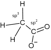 The methyl carbon is sp3 hybridised and has a tetrahedral geometry; the connected carbonyl carbon is sp2 hybridised that is doubly bonded to neutral oxygen and singly bonded to a negatively charged oxygen. However, both the oxygen is equivalent due to the delocalization of electrons through resonance.