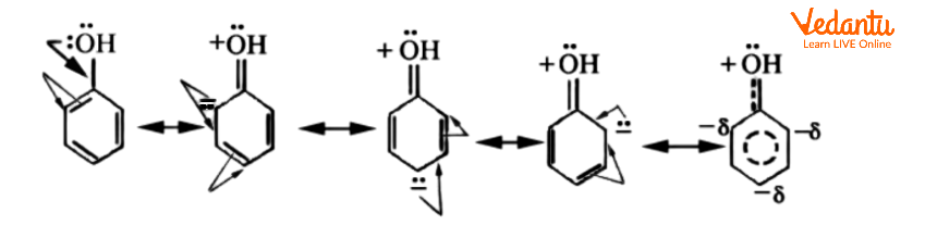 On the oxygen-atom of the -OH group attached to the ring, there are two nonbonding electron pairs. The interaction with the p-system distributes one of these into the ring. The ortho and para positions in resonance forms have a higher electron density than the meta positions. As a result of the electron delocalization, the resonance hybrid has negative charges in the ortho and para positions. Regardless of its nature, the electrophile (E+) would naturally gravitate toward these electron-rich centres.