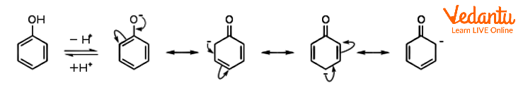 - In Phenol, the resulting phenoxide ion (C₆H₅O⁻) is stabilised by resonance, as the negative charge is delocalised over the entire benzene ring.