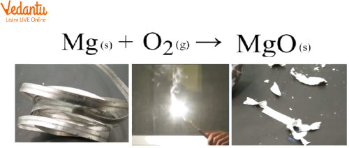 When most metals are burnt in air, they undergo a rapid oxidation reaction with the oxygen present. This chemical reaction results in the formation of a new compound called a metal oxide. For example, when a magnesium ribbon is burnt, it reacts with oxygen to produce a dazzling white light and a white, powdery ash of magnesium oxide (MgO).