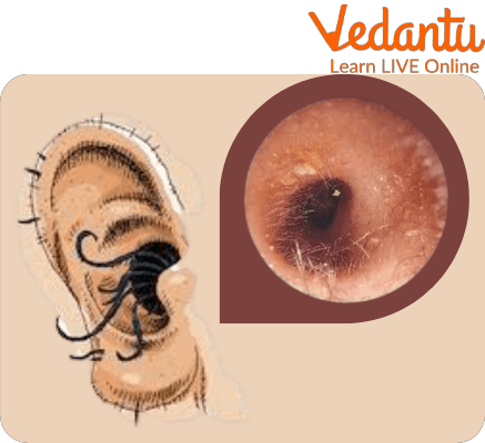 It collects sound waves from the funnel or earlobe and transmits them to the eardrum. This causes vibrations in the eardrum. The skin of the cavernous passage of the outer ear secretes a greasy substance like normal skin. This substance collects and forms ear wax. The wax helps collect dust and other particles.