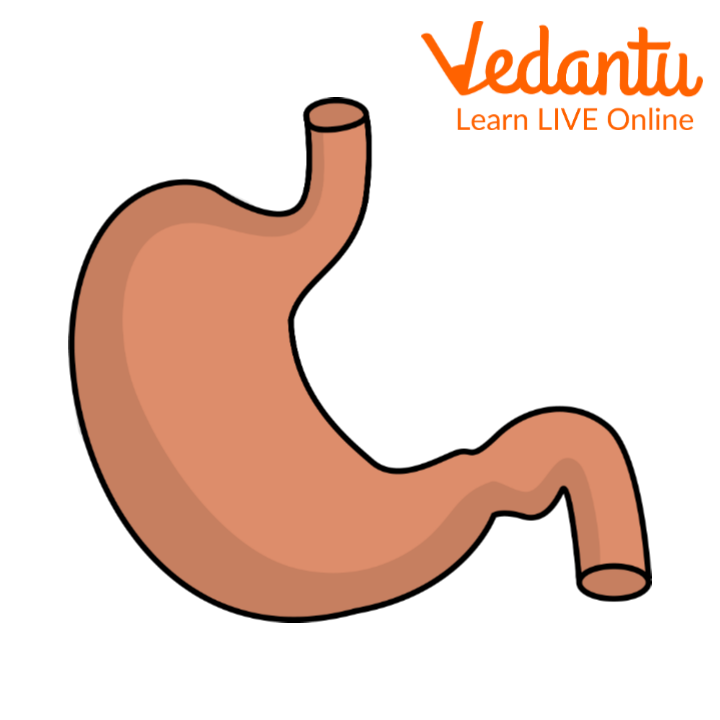 The stomach is a J-shaped, hollow muscular bag located in the upper abdomen. Its main job is to act as the body's food churner. After we swallow, food travels down the food pipe (esophagus) and enters the stomach. Here, it is mixed with strong digestive juices and churned by muscular contractions into a thick, soupy liquid called chyme, preparing it for the next stage of digestion in the small intestine.