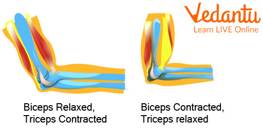 As mentioned earlier, Muscles work in pairs. Muscles can only pull bones but can't push them back to the mean position. This concludes that when muscles work they work in pairs of flexors and extensors. The flexor contracts to bend an appendage or limb at a joint. Then, when the movement is completed, the flexor relaxes and the extensor contracts to extend or straighten the limb at the same joint and the mean position is attained. For example, when we bend our elbow, the biceps muscles contract. Then the biceps relax and the triceps contract to straighten the elbow.