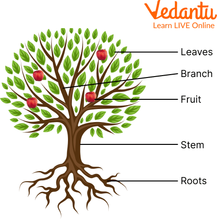 - Leaves: They are usually green and make food for the tree using sunlight, air, and water. This process is called photosynthesis.