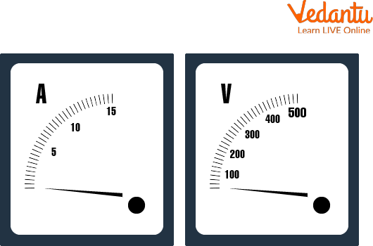 The ammeter measures the current flowing through the circuit and a Voltmeter measures the voltage flowing through the circuit.