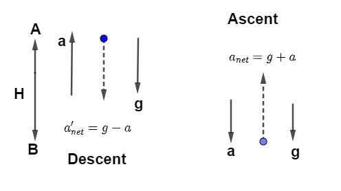 Now, during the descent the distance covered by the body will be H with acceleration $a{'_{net}} = g - a$ with time ${t_2}$ so using newton’s equation of motion as