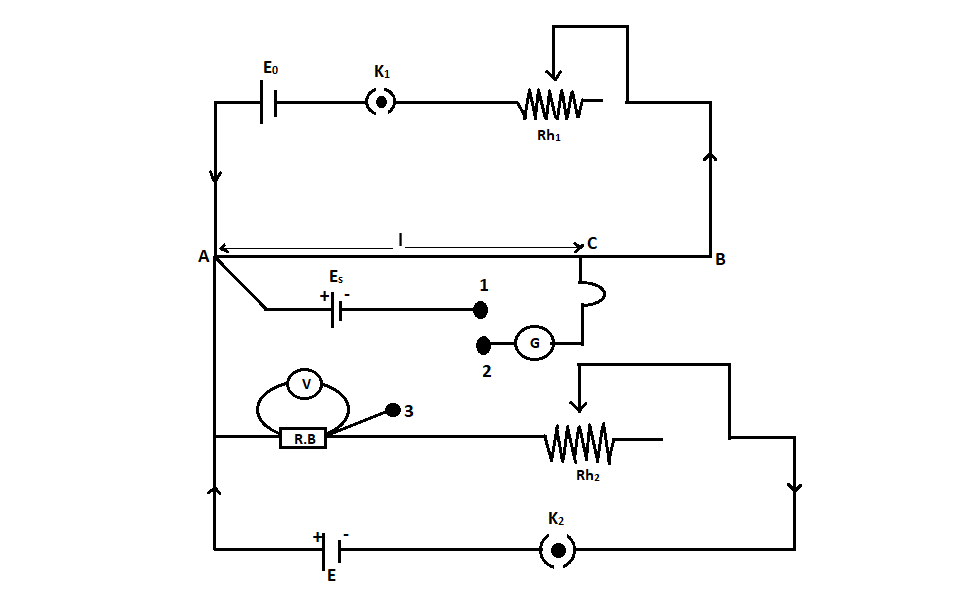 It consists of a primary circuit that is shown in the above section. The positive terminal of the standard cell is connected to point A in the secondary circuit. Point A is the high potential end. The negative terminal of the standard cell is connected to the first terminal of a two-way key. As shown in the figure, the cell $E$, key, rheostat, and resistance box is connected in a series connection. One end of the resistance box(high potential end) is connected to the point of high potential $A$ and the point of the resistance box having low potential is connected to the third terminal of a two-way key.
