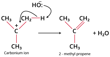 $\left(\mathrm{CH}_{3}\right)_{3} \mathrm{C}-\mathrm{Br} \stackrel{\mathrm{Alc} \mathrm{KOH}}{\rightarrow}\underset{2-\text{methyl propene}}{\left(\mathrm{CH}_{3}\right)_{2} \mathrm{C}=\mathrm{CH}_{2}}+\mathrm{H}_{2} \mathrm{O}+\mathrm{Br}^{-}$