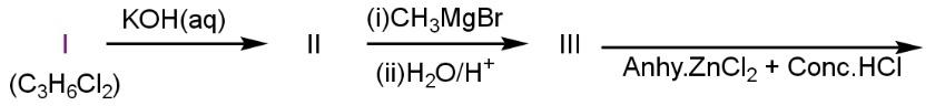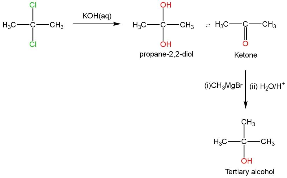 Compound C which when reacting with aqueous KOH gets hydrolyzed and gives \[propane-2,2-diol\] (unstable) in step 1. This compound further releases a water molecule to give a ketone which is in equilibrium with the compound formed in the first step. This ketone, further attacked by Grignard reagent (negative part,\[C{{H}_{3}}\] of Grignard reagent attack ketonic carbon, positively charged) and oxygen (negatively charged)of ketone group get protonated in presence of water molecule to give the hydroxyl group (\[OH\]group) such as