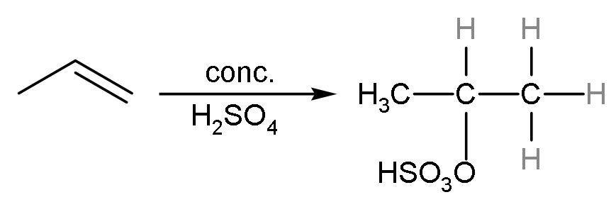 Propene reacts with concentrated sulphuric acid to give an additional reaction. In this reaction, ${{\text{H}}^{+}}$ of sulphuric acid adds to more hydrogenated double-bonded carbon and $^{-}\text{OS}{{\text{O}}_{3}}\text{H}$ to less hydrogenated carbon atom. The reaction is