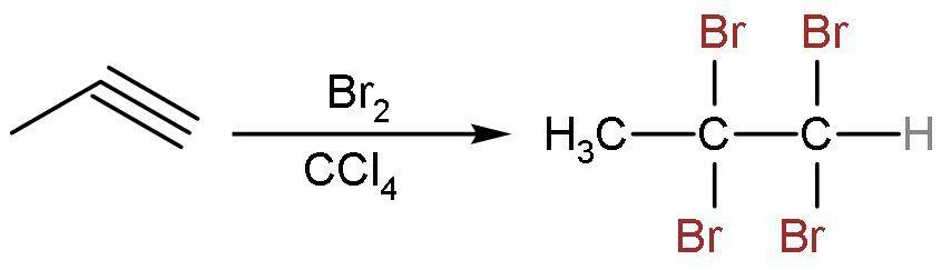 Similarly, propyne reacts with $\text{B}{{\text{r}}_{2}}$ in $\text{CC}{{\text{l}}_{4}}$ to give addition reaction only. Here, the triple bond is replaced by the single bond. The 2 moles of $\text{B}{{\text{r}}_{2}}$ in $\text{CC}{{\text{l}}_{4}}$ will be needed here. The reaction is