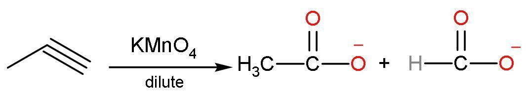 (C) Dilute $\text{KMn}{{\text{O}}_{4}}$: In this reaction, propyne reacts with potassium permanganate to give carboxylic acids of lesser carbon atoms. It means that the triple bond is broken from the presence of a triple bond. The reaction is