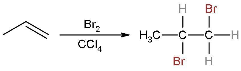 (B) $\text{B}{{\text{r}}_{2}}$ in $\text{CC}{{\text{l}}_{4}}$: Propene is an unsaturated compound. So, it gives an additional reaction with bromine in a nonpolar solvent of carbon tetrachloride. The double bond is replaced by the single bond between the carbon atoms and additions of bromine atoms on both the double-bonded carbon atoms take place. The reaction is