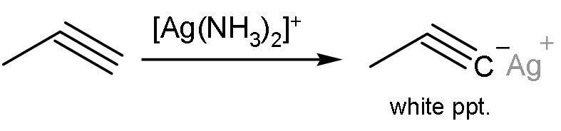 Propyne, on the other hand, gives this reaction. Propyne has a triple bond between ${{\text{C}}_{1}}-{{\text{C}}_{2}}$. This means that the alkyne is terminal. Terminal alkynes have acidic hydrogens. These hydrogens are removed and insoluble precipitates are formed. The reaction is