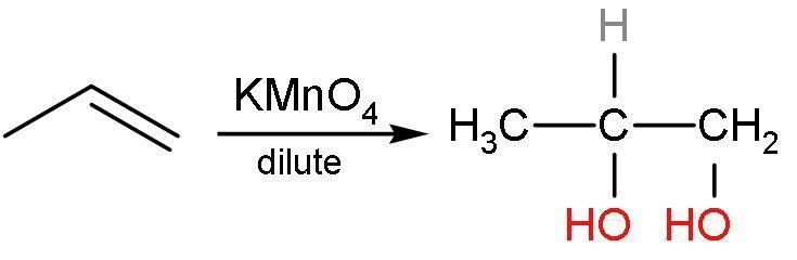 Propene reacts with potassium permanganate to give an additional reaction. In this, the hydroxyl groups are added to both the double-bonded carbon atom. This is vicinal diols or 1,2-diols. The double bond is replaced by the alcohol groups. The reaction is