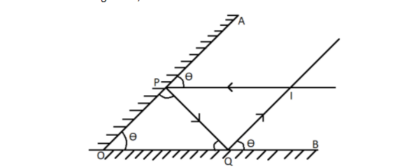 Here IP is the incident ray and QI is the reflected ray. The angle $\angle POQ$ is the angle between the mirrors equal to $\theta $. Now as the angle with which IP falls on A is $\theta $. So from geometry, $\angle OPQ$ is also equal to $\theta $. And similarly the angle which QI makes with B is $\theta $. So again from geometry, $\angle OQP$ is also equal to $\theta $. So in the triangle $\Delta POQ$, the three angles are $\theta $ each.