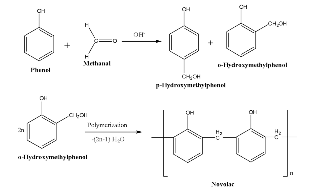 Novolac is prepared by condensation of phenol with methanal using an acid or a base as a catalyst. The reaction gives the products: o-Hydroxymethylphenol and p-Hydroxymethylphenol. These derivatives further react with phenol to form a linear polymer novolac. Novolac is widely used in paints. The reaction is given below: