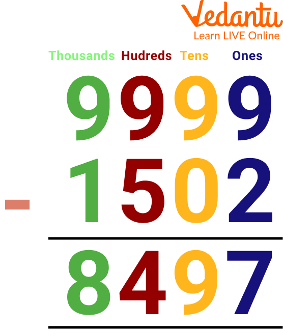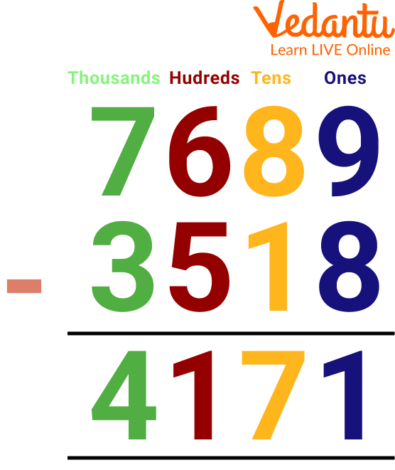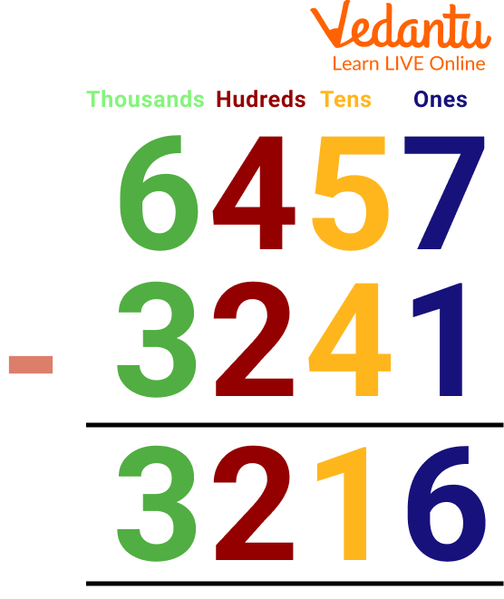 In mathematics, subtraction is a mathematical operator which is used for calculating the difference between two numbers. 4-digit subtraction refers to the subtraction of numbers in which the minuend is of 4 digits and the subtrahend is either of 1, 2, or 3 digits. In 4-digit subtraction, we subtract the numbers one by one according to their place values, that is, ones, tens, hundreds, and thousands. Here we will discuss 4-digit subtraction without borrowing and solved examples on subtraction without regrouping. So let's get started.