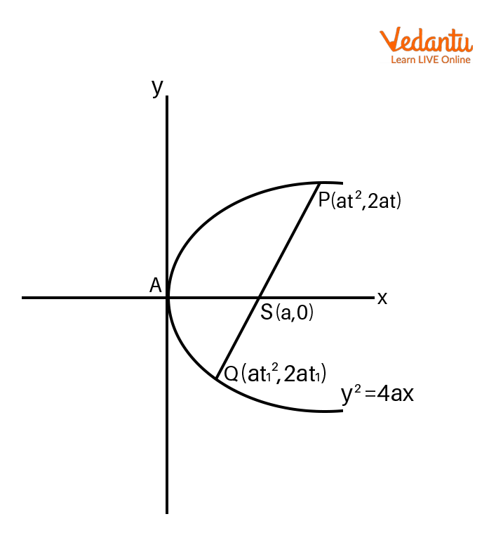 A chord joining the points P(at₁², 2at₁) and Q(at₂², 2at₂) on the parabola y² = 4ax becomes a focal chord if and only if it passes through the focus (a, 0). The necessary and sufficient condition for this is t₁t₂ = -1. This is a very important property used in many proofs and problems.