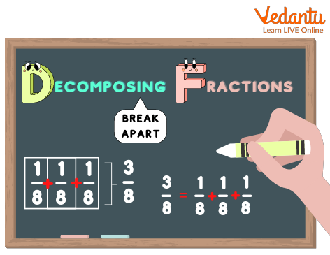 In mathematics, to decompose a fraction means to break it down into the sum of two or more smaller, simpler fractions. For instance, the fraction 5/8 can be broken down into 2/8 + 3/8. The total value remains the same, but it is expressed as a sum of its parts.
