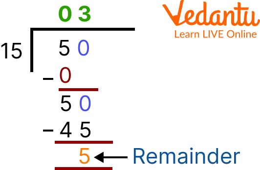 Thus, the quotient and the remainder of the division of 50 and 15 are 3 and 5, respectively.