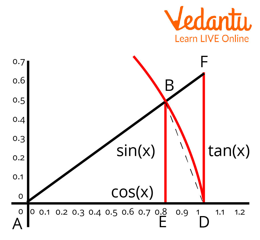 \[\begin{array}{l}AD.\sin A\; < x.AD < \;AD.\sin A\;/\;\cos A\\ \Rightarrow \; = \;1\; < x\;/\;\sin X < \;1\;/\;\cos X\end{array}\]