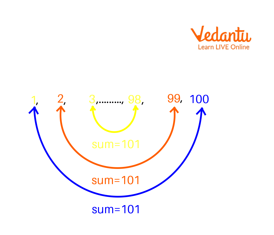 We can recognize that there are \[50\]such pairs whose sum is \[101\] in the series \[1,\text{ }2,\text{ }3,...,\text{ }100.\] As a result, the sum of all terms in this series is \[50\times 101\] =\[5050\].