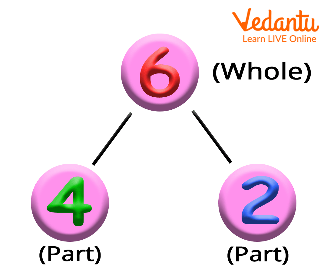 A number bond is a model that represents the relationship between a number (whole) and its parts. For example, 4 + 2 = 6.