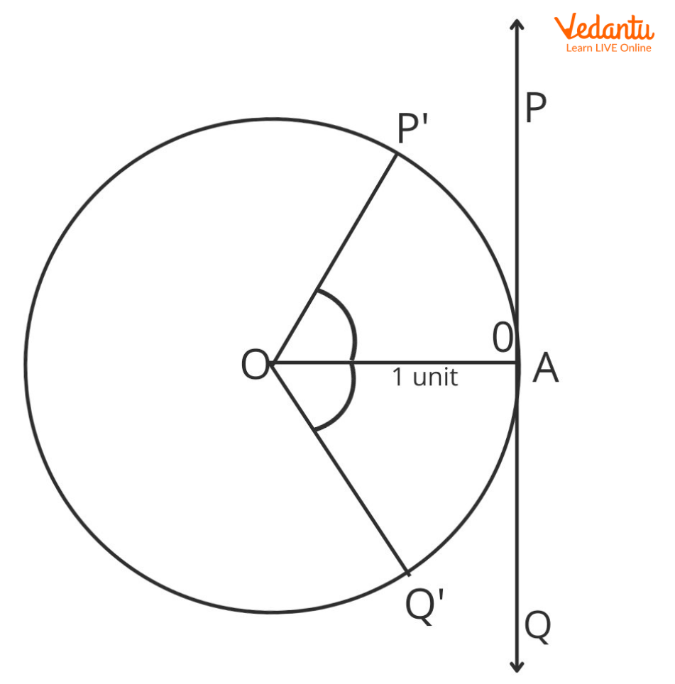 Take a thread and measure the distance AP and cut it out, then, starting from A, start placing the cutting of the thread along the circumference of the circle in an Anti-Clockwise direction. Label this point as\[{\rm P}'\].Similarly, measure the same distance along the negative axis (\[AP = AQ\]). Now, take that thread and place it along the circumference of the circle in a Clockwise direction. Label that point as \[Q'\].