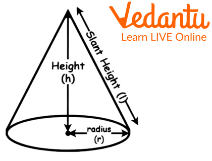 A cone is another three-dimensional shape (3D shape) with a flat bottom (round shape) and a pointed tip on the top. Its shape is similar to a rotated triangle. The sharp end of the top of the cone is called the "top". A cone also has a curved surface. A cone has a height and a radius. In addition to height, cones have an oblique height, which is the distance between a vertex and a point on the perimeter of the cone's circular base.