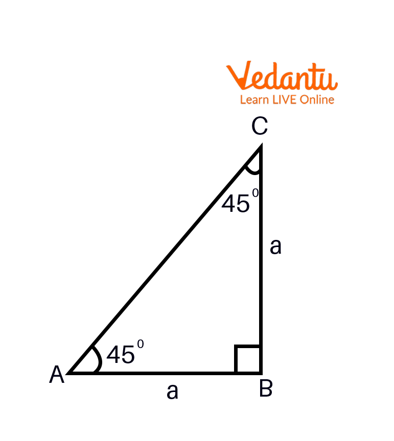 $\tan 45^{o}=\frac{BC}{AB} = \frac{a}{a}=1$