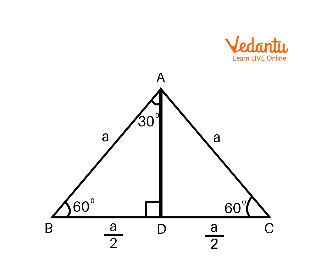 Now, in right triangle $ADB, \angle{BAD} = 30^{o}$ and $BD = \dfrac{a}{2}$.