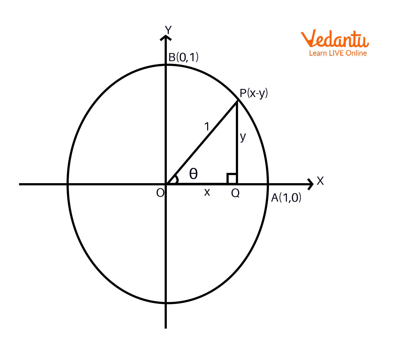 Take a look at the illustration below, which displays a circle with a radius of $1$ unit centered at the origin.