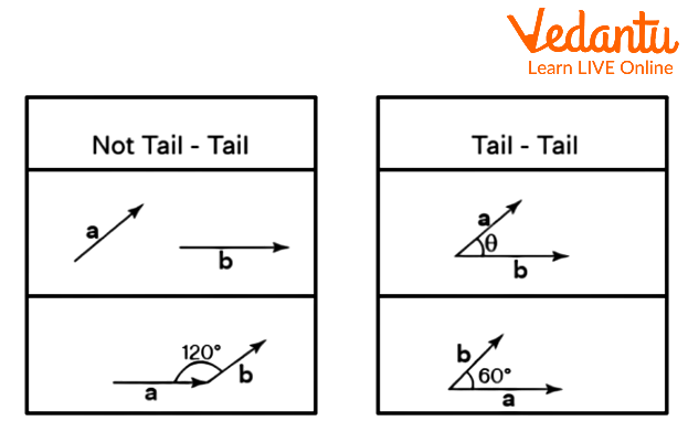 When there is an intersection of tails and an angle is formed and this is called the angle between two vectors. Suppose vectors are not joined then we need to join them by shifting one vector using parallel shifting. Some examples are shown below: