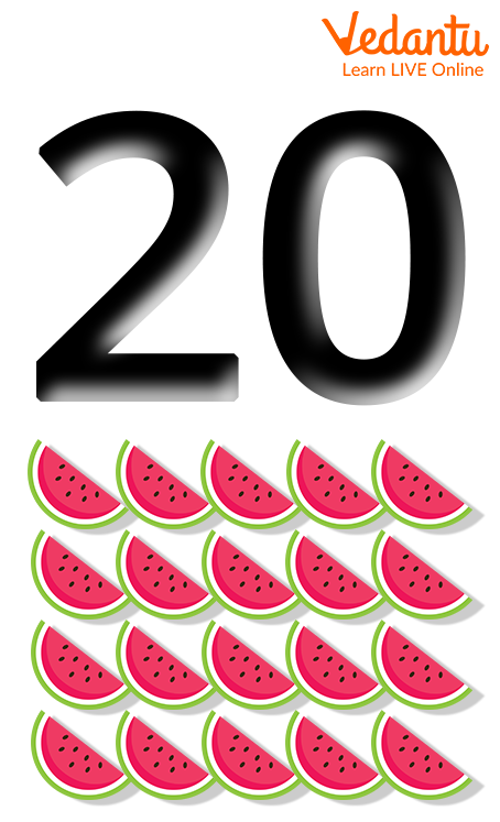 In Maths, the number 20 represents a count or value of twenty items. It is a whole number that comes after 19 and before 21. It is made up of two tens and zero ones (20 = 2 tens + 0 ones). For example, if you have two packs of ten pencils each, you have 20 pencils in total.