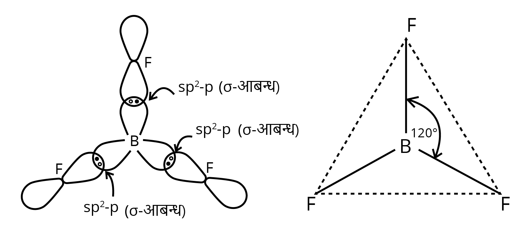 ये $\mathrm{sp}^{2-}$ संकर कक्षक F परमाणुओं के कक्षकों के साथ अतिव्यापन करके बन्ध बनाते हैं। इस प्रकार $\$ B\left\{F^{\wedge} 3\right\}$ में बन्ध कोण $120^{\circ}$ होता है तथा अणु त्रिकोणीय व समतल होता है।