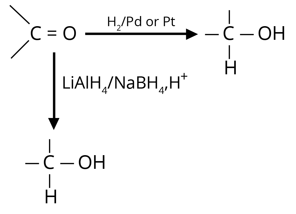 Reduction to alcohols can be achieved either by hydrogenation in the presence of Pt or Pd or by LiAlH4/NaBH4.