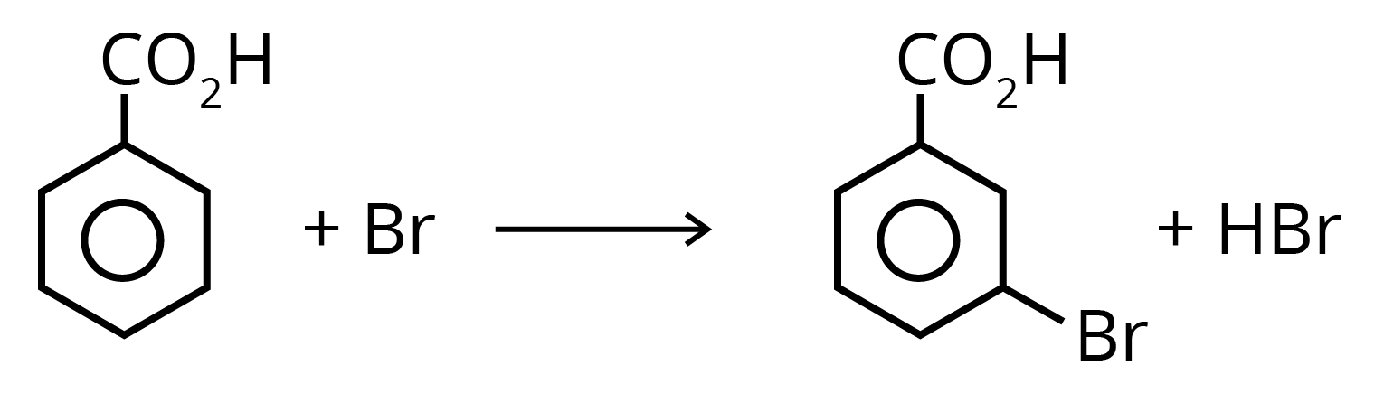 6. Benzoic acid is attacked by the usual electrophilic reagents Chlorine, Bromine, Nitric and sulphuric acids to give m-derivatives.