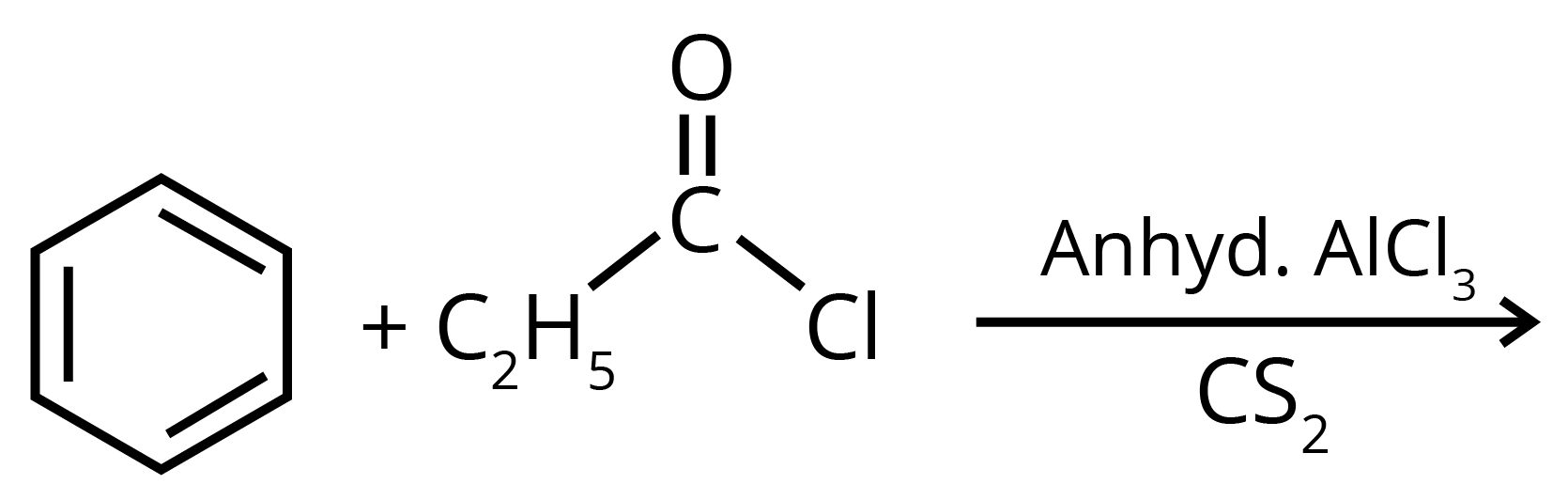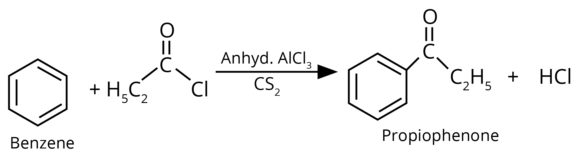 Sol: The product formed in the above reaction will be propiophenone. The structure of this compound is given below. This reaction takes place in the presence of lewis acid and non polar medium.