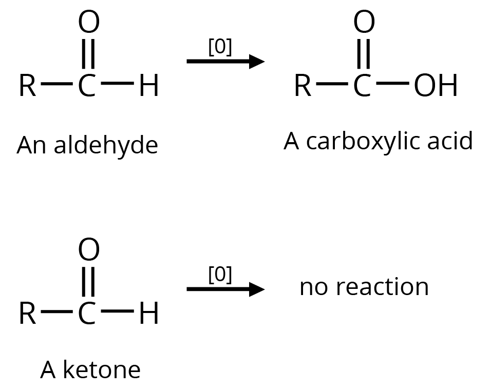 A specific oxidant for RCHO is Ag(NH3)2+. Ketones do not give this reaction