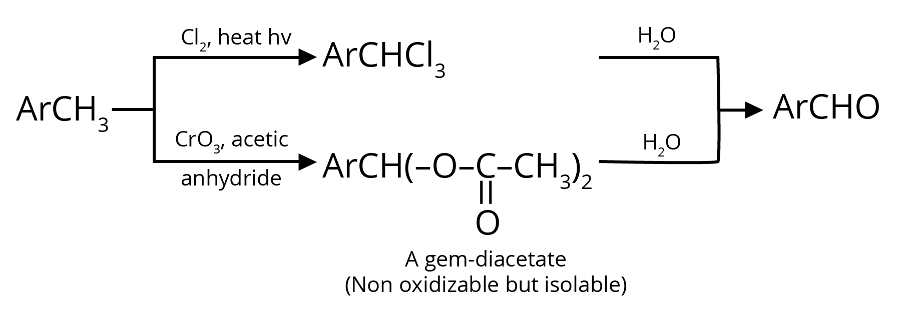 Trick: Two hydroxyl groups on the same carbon are unstable and lead to dehydration and form an aldehyde or ketone (formation of double bond oxygen).