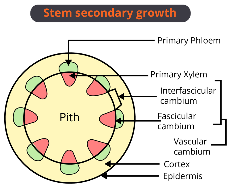 Intra and interfascicular cambium unite to form a ring of cambium known as vascular cambium in the stems of dicotyledonous plants, producing secondary xylem on the inner side and secondary phloem on the outer side. Hormonal influences play a role in this.