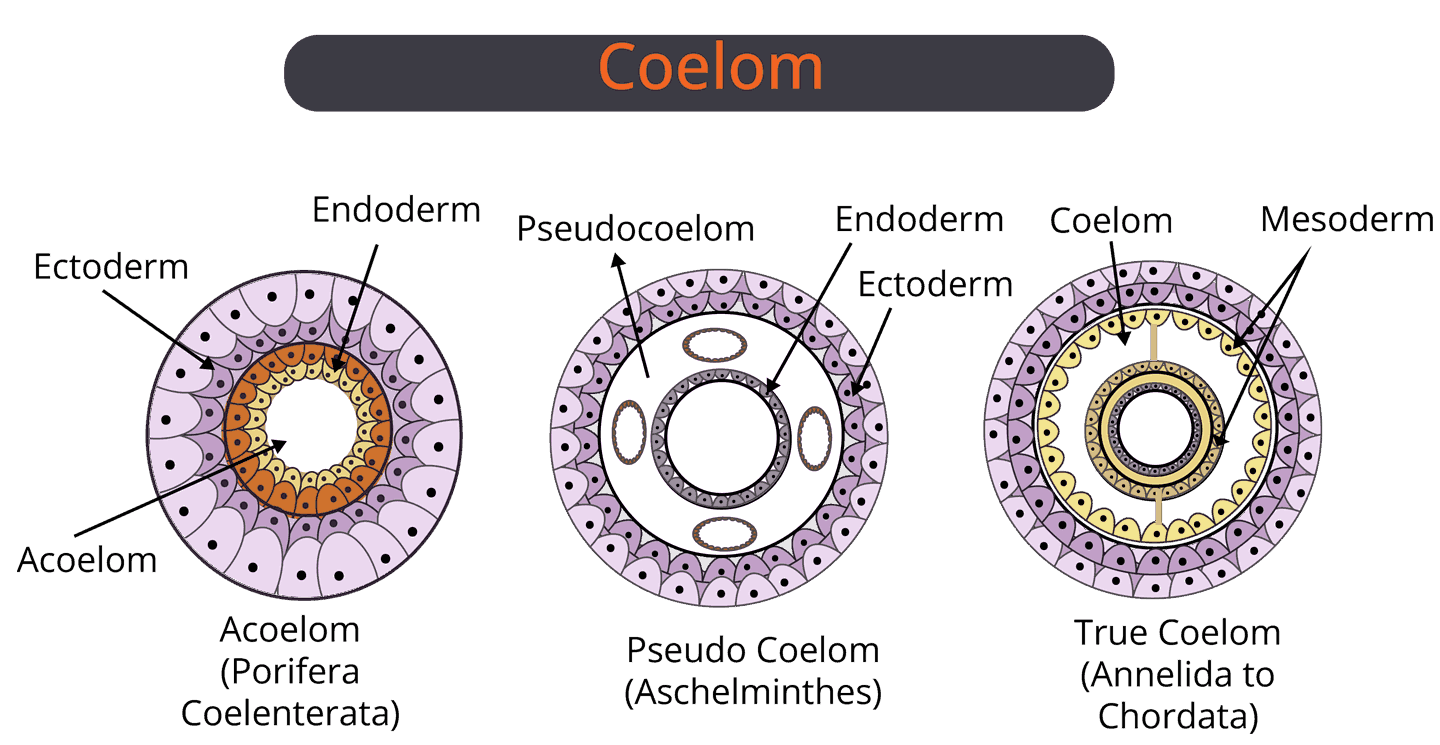 The animals which possess true coelom are called coelomates. The true coelom is a body cavity that arises as a cavity in the embryonic mesoderm. In this case, the mesoderm of the embryo provides a cellular lining called the peritoneum. For example; Annelida Arthropoda Mollusca Echinodermata Hemichordata Chordata.