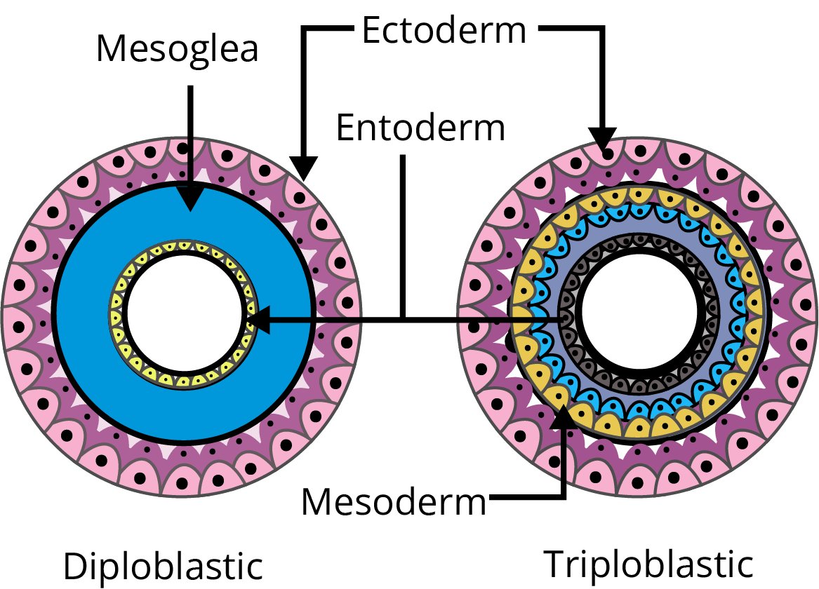 Diploblastic - When two germinal layers i.e,. Ectoderm and endoderm are present in an organism, the animals are called diploblastic. An undifferentiated layer, mesogloea, is present in between the ectoderm and endoderm. For example; Cnidarians