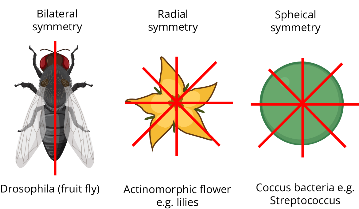 4. Spherical Symmetry - In spherical symmetry, an organism can be cut from any plane and even then it will be able to divide into two equal halves. For example; Volvox