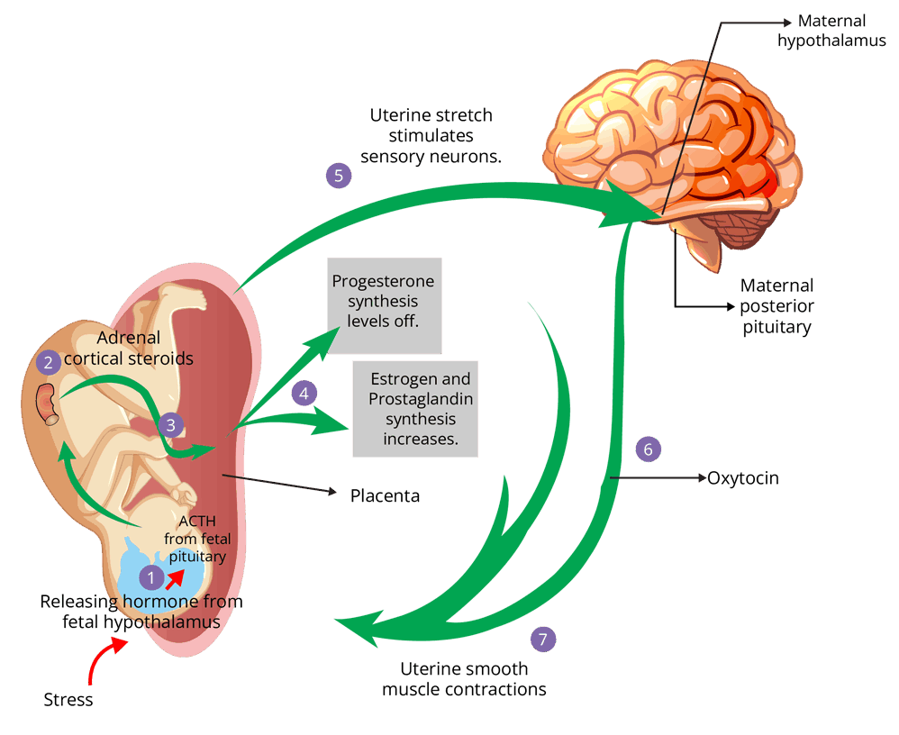 On average, the duration of pregnancy in human females is about 9 months, which is termed as gestation period. At the end of the pregnancy, vigorous contraction of the uterus causes expulsion or delivery of the foetus, which is termed as parturition. It is a complex neuroendocrine mechanism.