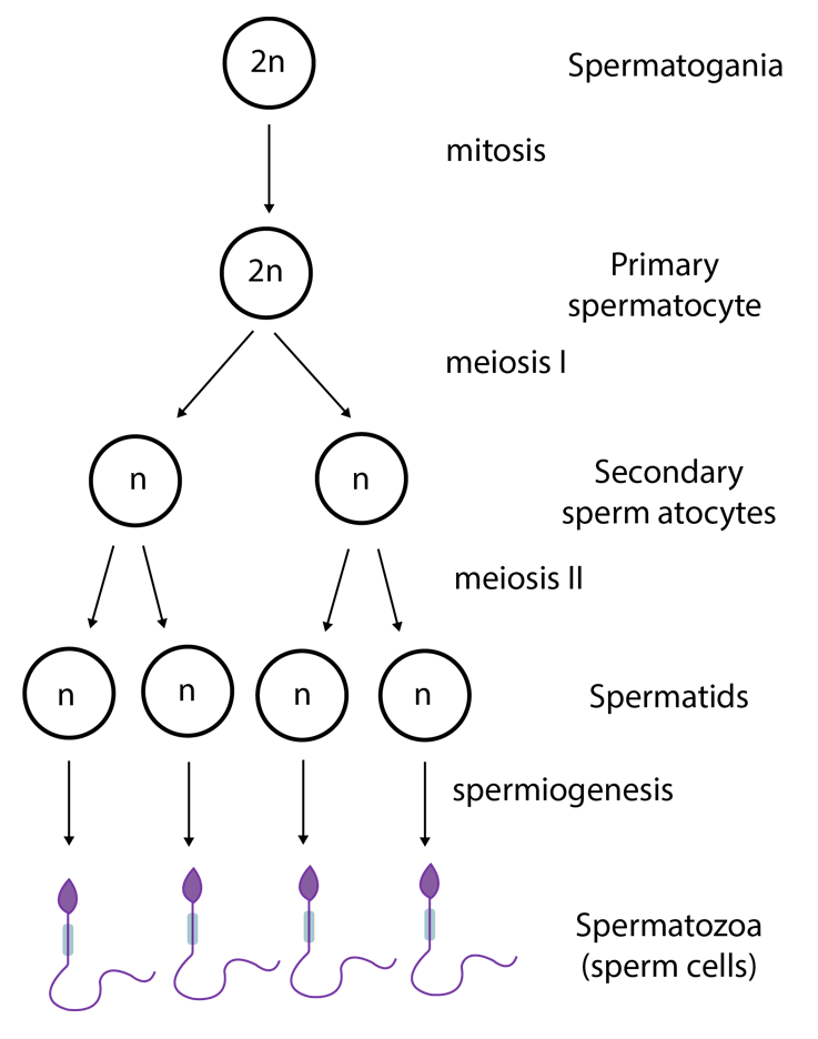Ans: Spermatogenesis is the process of formation of sperms which represents the male gametes. Fusion with the female gamete (egg), it results in the production of a zygote that develops into an embryo after passing through the various developmental stages. The sequence of spermatogenesis is given in the illustration below. The secondary spermatocytes are divided by meiosis II and give rise to two spermatids.