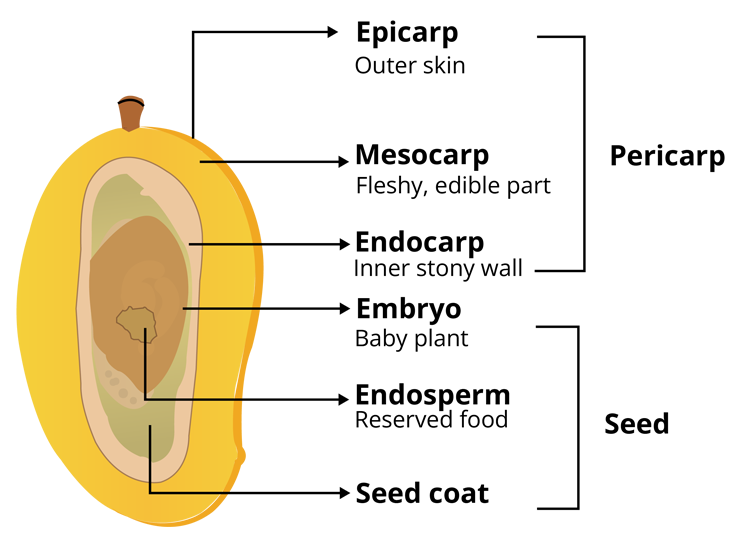 It is the seed bearing structure found in flowering plants. After the ripening, the ovary gets converted into fruit which protects the seeds and plays an important role in the seed dispersal. The parts of the fruit are given in the diagram below.