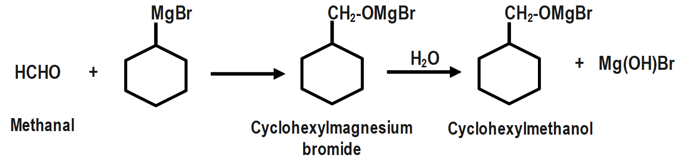 Methanal reacts with cyclohexyl magnesium bromide, in presence of dry ether, which gives an intermediate product. This intermediate product when reacts with a given reagent, as shown above, gives cyclohexyl methanol as a product.